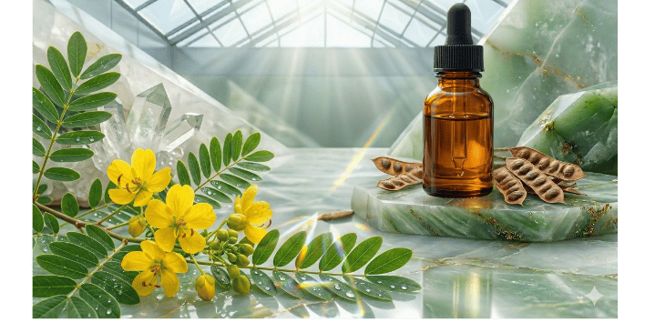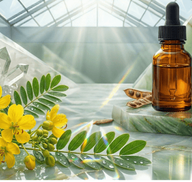 Nuestro ácido hialurónico vegetal no nace en un laboratorio sintético; proviene de la majestuosa Cassia angustifolia, también conocida como senna alexandrina. En esta imagen nítida y real, puedes apreciar la verdadera fuente de tu hidratación: sus hojas pinnadas y sus vibrantes flores amarillas. Esta planta, cultivada y respetada por siglos en la medicina tradicional, es el origen puro de los polisacáridos que componen nuestro hialurónico, garantizando una biocompatibilidad total con tu piel.